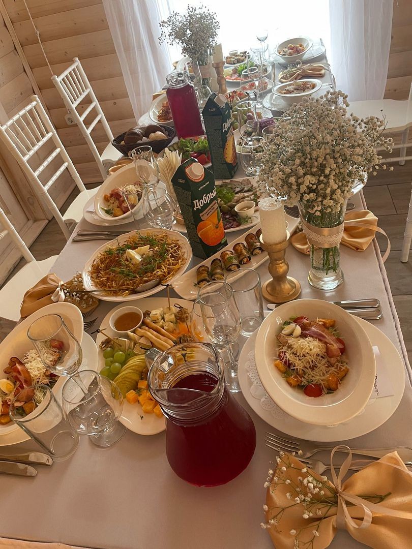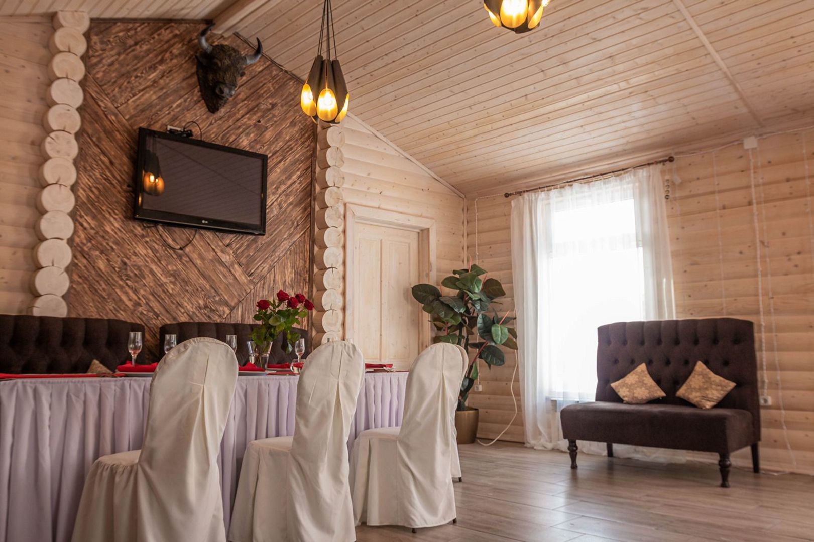 Для банкета вам предложат несколько площадок в зависимости от количества гостей. Для тесного круга друзей и родственников подойдёт банкетный зал на 30 человек в уютном доме, построенном из сруба натурального дерева. Внутри приятный интерьер, столы, стулья, мягкие диваны, плазменный экран. Рядом находится мангальная зона, где можно пожарить сочные шашлыки, и зона отдыха с качелью.
