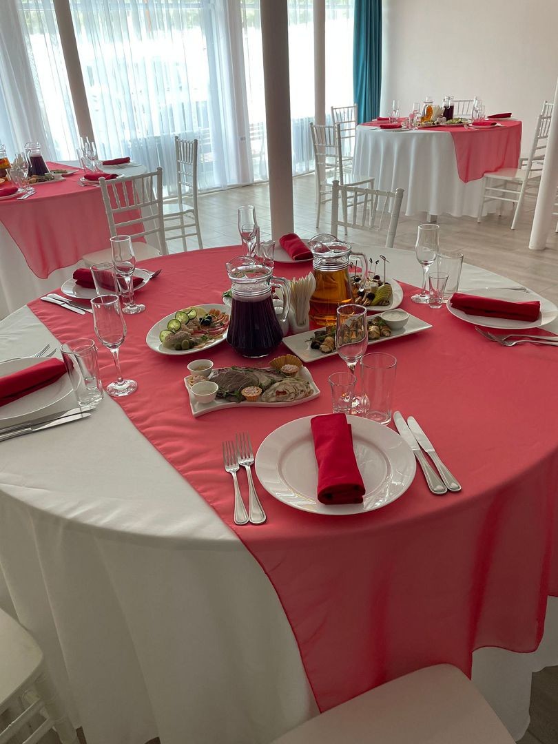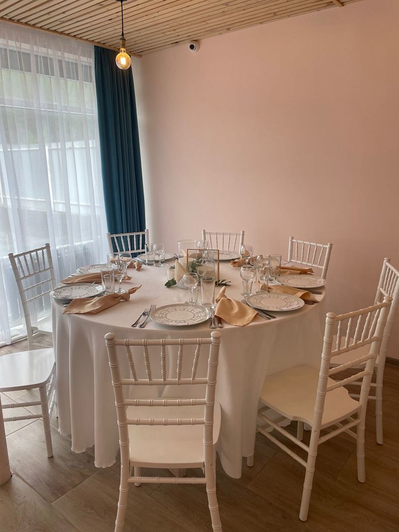 В банкетном зале на 50 человек также есть вся необходимая мебель для комфортного размещения приглашенных. В помещении панорамные окна, изящные белые колонны, потолок оформленный лёгкой белой тканью, которая создает эффект волн.