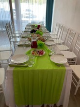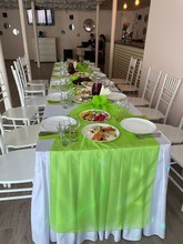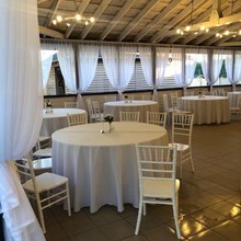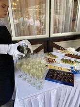 В банкетном зале на 50 человек также есть вся необходимая мебель для комфортного размещения приглашенных. В помещении панорамные окна, изящные белые колонны, потолок оформленный лёгкой белой тканью, которая создает эффект волн.